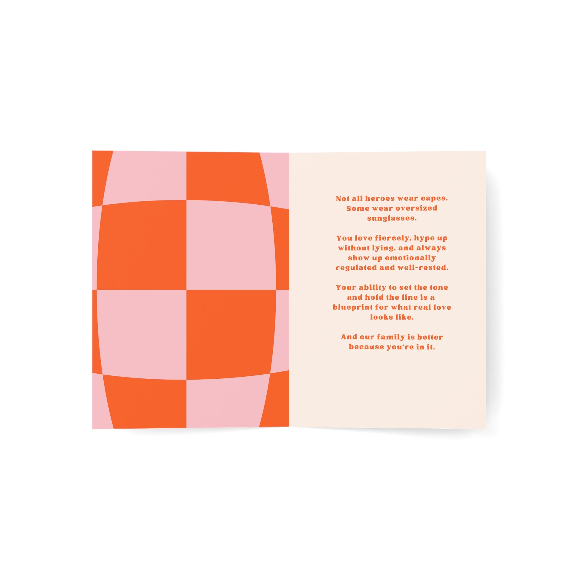 Inside: Not all heroes wear capes. Some wear oversized sunglasses. You love fiercely, hype up without lying, and always show up emotionally regulated and well-rested. Your ability to set the tone and hold the line is a blueprint for what real love looks like. And our family is better because you're in it.