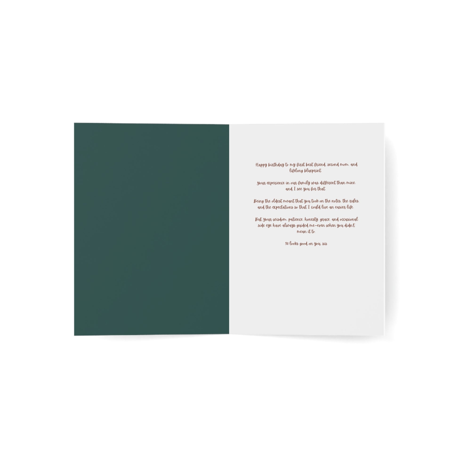 Inside: Happy birthday to my first best friend, second mom, and lifelong blueprint. Your experience in our family was different than mine, and I see you for that. Being the oldest meant that you took on the notes, the rules, and the expectations so that I could live an easier life. But your wisdom, patience, honesty, grace, and occasional side eye have always guided me--even when you didn't mean it to. 38 looks good on you, sis.