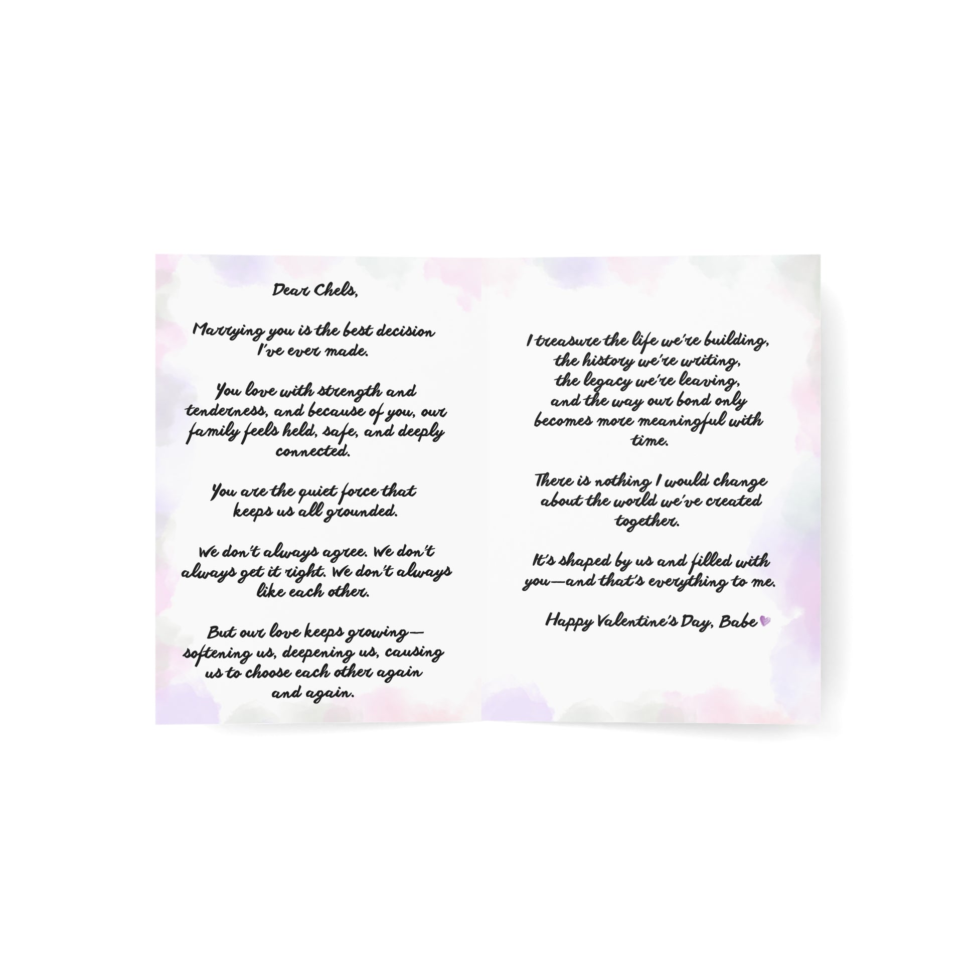 Inside: Dear Chels, Marrying you is the best decision I've ever made. You love with strength and tenderness, and because of you, our family feels held, safe, and deeply connected. You are the quiet force that keeps us all grounded. We don't always agree. We don't always get it right. We don't always like each other. But our love keeps growing--softening us, deepening us, causing us to choose each other again and again. I treasure the life we're building, the history we're writing, the legacy we're leaving, and the way our bond only becomes more meaningful with time. There is nothing I would change about the world we've created together. It's shaped by us and filled with you--and that's everything to me. Happy Valentine's Day, Babe.